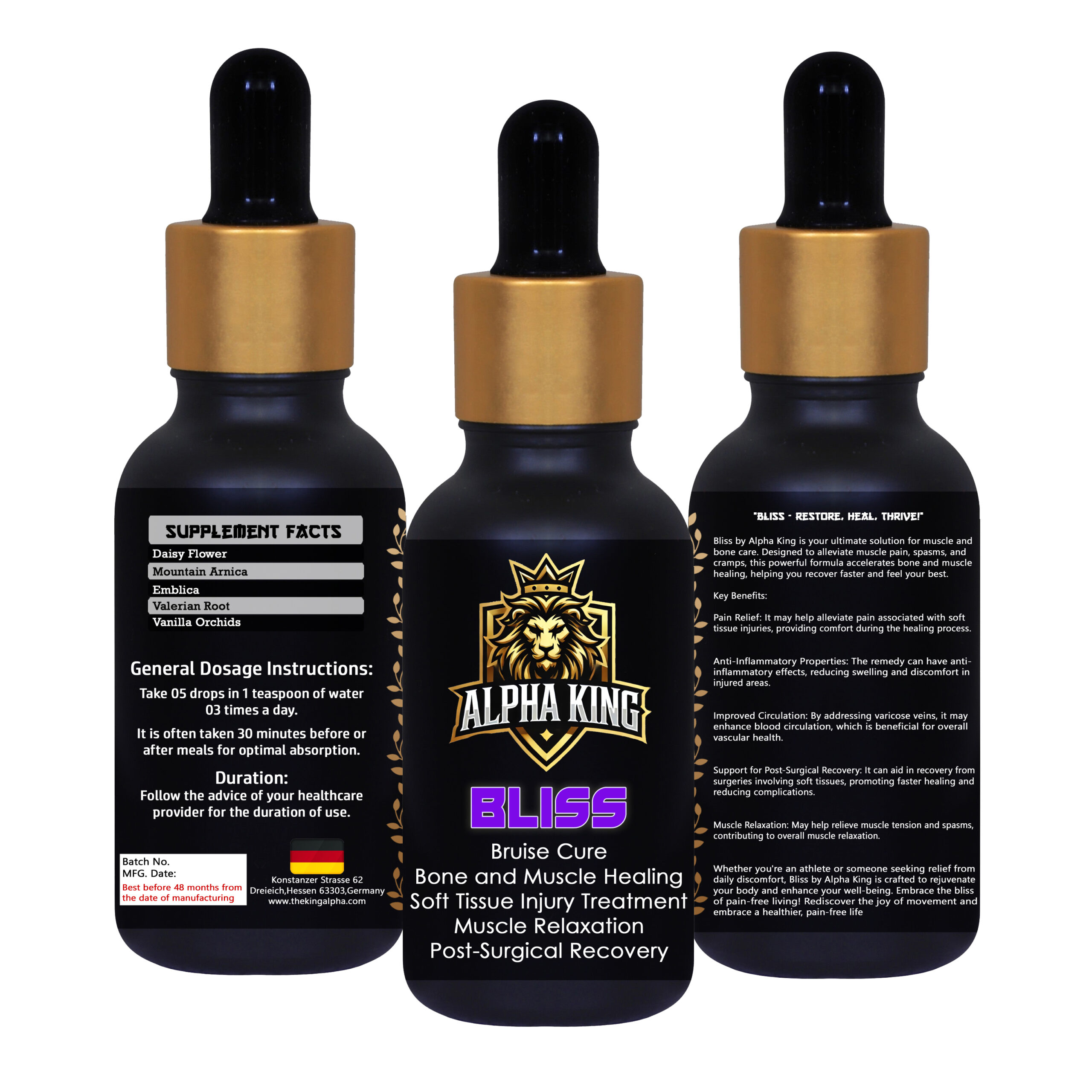 “Alpha King BLISS is a premium formulation developed to support bruise healing, facilitate bone and muscle recovery, aid in soft tissue repair, promote muscle relaxation, and enhance post-surgical rehabilitation. Engineered for optimal efficacy, it is tailored to accelerate the healing process and improve overall recovery outcomes.”