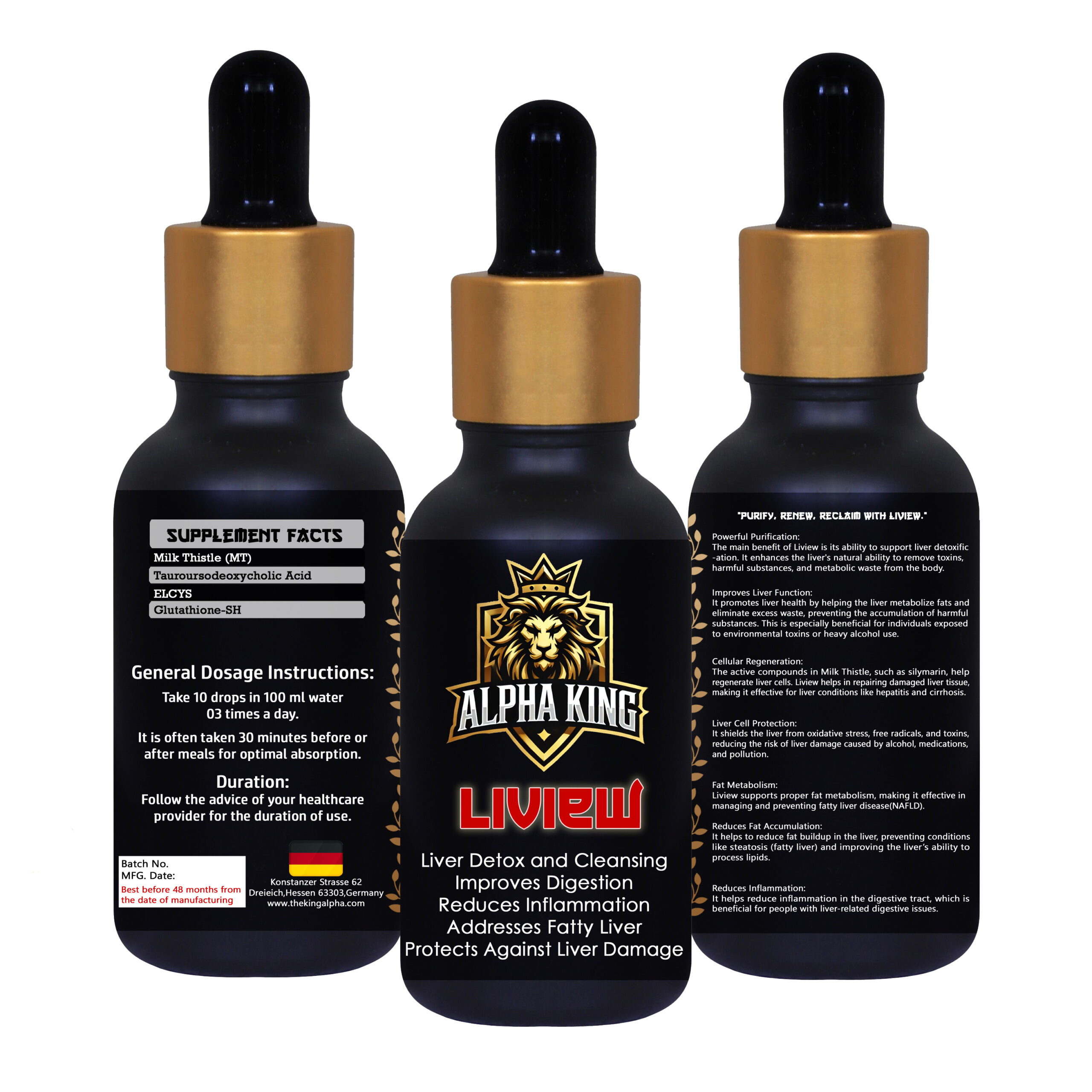 “Alpha King LIVIEW is a premium formulation designed to support liver detoxification and cleansing. It promotes healthy digestion, reduces inflammation, and helps address fatty liver issues. LIVIEW also offers protection against liver damage, ensuring optimal liver health and overall well-being.”