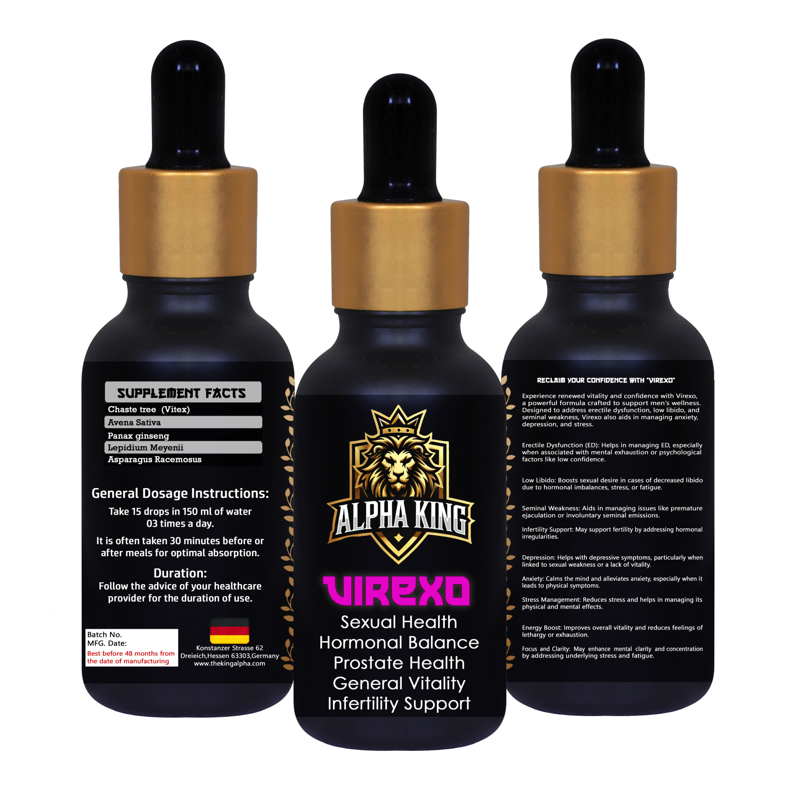 “Alpha King VIREXO is a premium supplement designed to support sexual health, promote hormonal balance, and enhance prostate health. It helps boost general vitality and offers support for infertility, improving overall well-being and ensuring optimal reproductive function.”